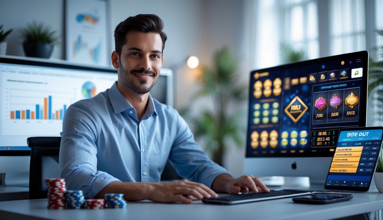 Seorang pria duduk di meja dengan perangkat digital yang menampilkan permainan slot online, terlihat fokus dan percaya diri.